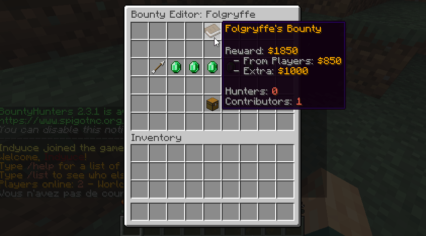 This GUI can be used to edit a current bounty. It can be used to visualize both the players who put money into that bounty and the portion of the bounty that is due to automatic bounties. Use /bounties edit <player> to open up that edition GUI.