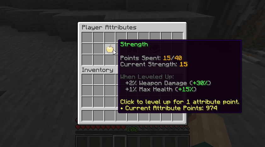 Attributes are super classic RPG "stats" which players can level up to unlock new perks. These perks includes additional stats (max health, damage, cooldown reduction...) and the ability to use certain items. This very classic RPG feature adds more theory crafting material to your server.