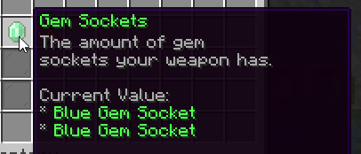 You can display the gem color on an item using the Displayed Type option. For example, if your gem is a blue gem stone, set the displayed type option to Blue Gem Stone. By default, the item type is a red lore tag which is displayed right under the item name. You may also display the gem color using a different material, like a blue diamond for blue gem stones. Last but not least you may also use the item lore (Can be applied onto blue sockets.).