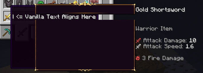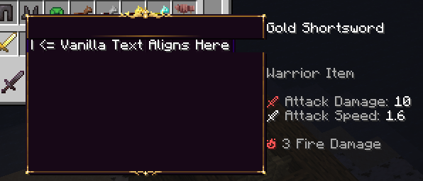 align_text is an integer; it can be used to horizontal-shift all lore lines and item name at once. This is usually used to account for tooltip textures which are "thicker" than others. Just like the option above, you usually want to leave it to 0, align all lore lines using negative space, and only then shift them all at once using this option. In our case, our tooltip textures are as "thick" as the vanilla tooltip so there's no need to use a non-zero value.
