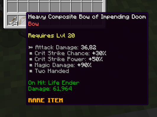 The default item is a bow with some attack damage and crit chance. The first Heavy modifier makes it two-handed, adds a few attack points and some critical strike power. The second modifier which has a suffix adds an on-hit ability.