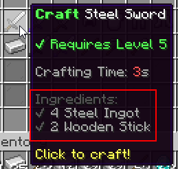 The most important part about crafting recipes is the recipe ingredients (physical items any player must have to use the recipe). Recipes each have a list of ingredients the player must have in their inventory in order to use the recipe. There are multiple types of incredients, including: