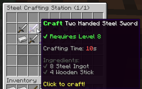 Crafting stations are UIs players can open to easily craft items through recipes which require ingredients and conditions. Ingredients are physical requirements (items which players must have in their inventory in order to proceed with the craft) whereas conditions are virtual (money, class, level...) requirements.