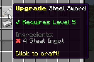 - 'mmoitem{type=MATERIAL,id=STEEL_INGOT,amount=4}'This upgrade recipe allows players to upgrade the item Steel Sword. Upgrading recipes NOT support crafting time, therefore they must all be instant, as if you used a consumable. In order to use this recipe, the player must be at least level 5, and must have 4 steel ingots in his inventory.
